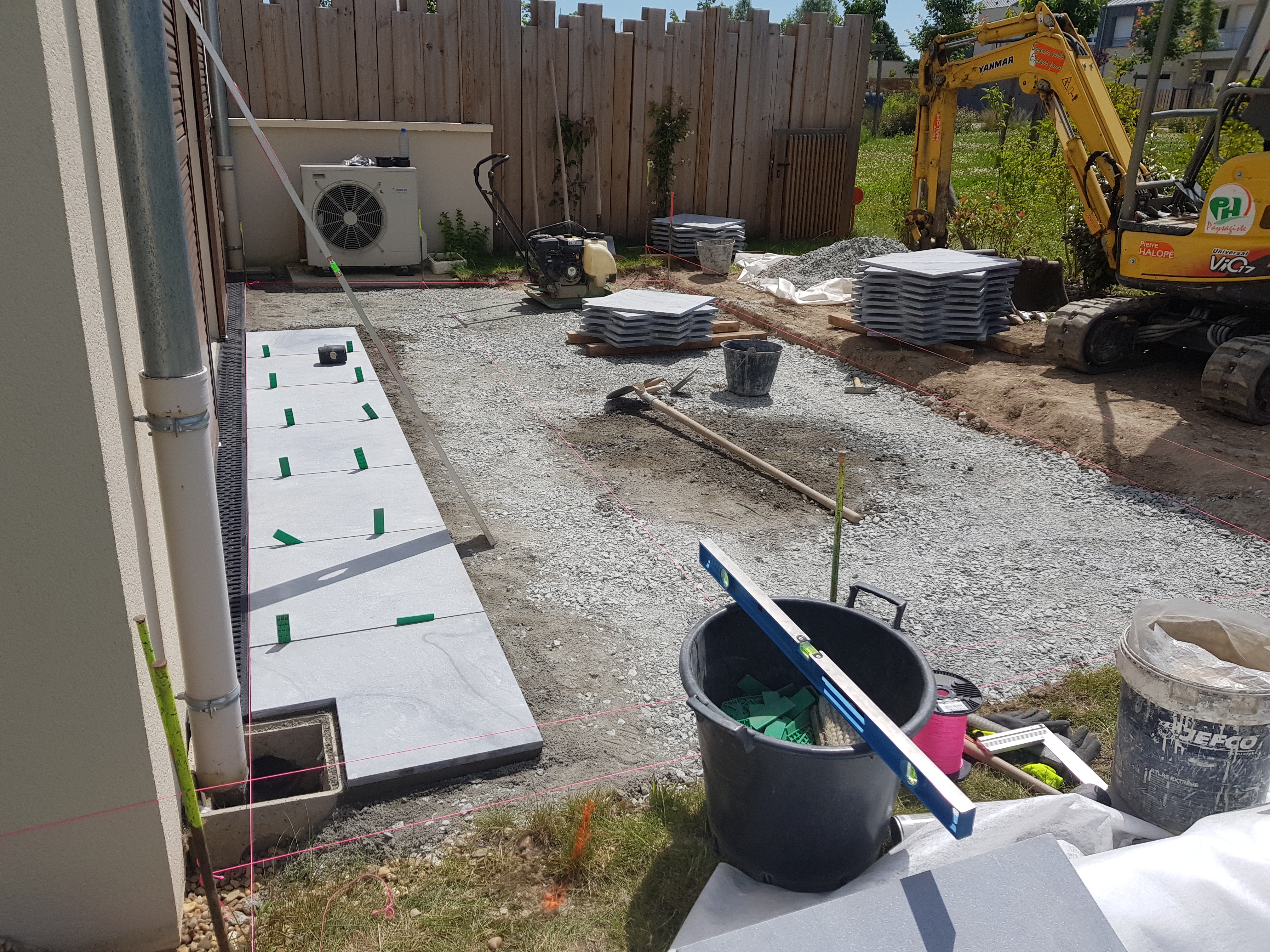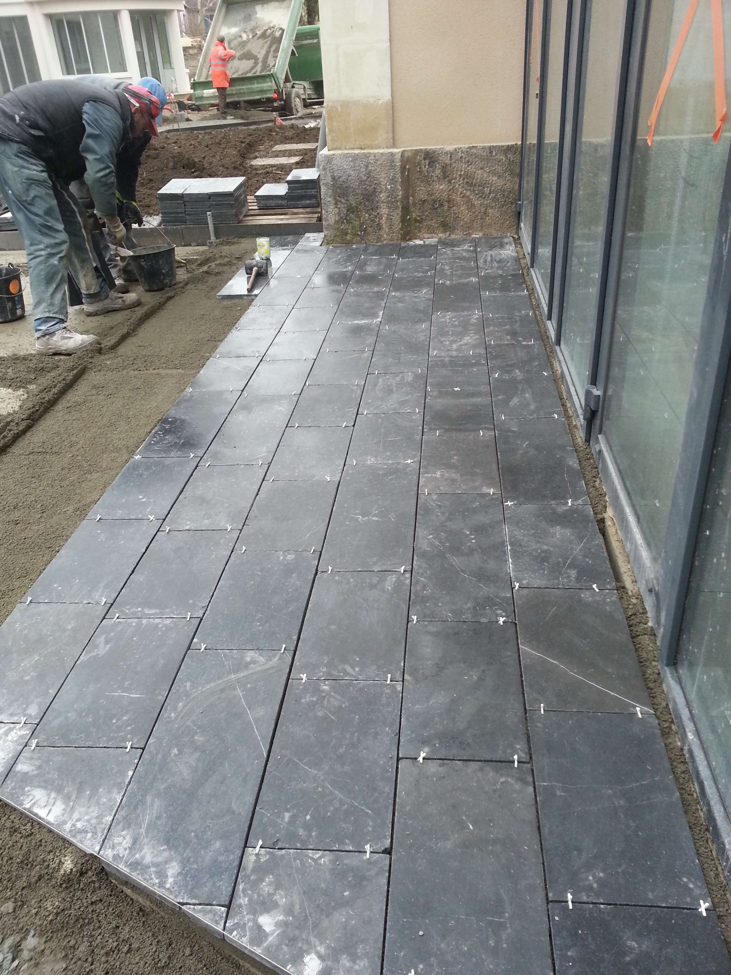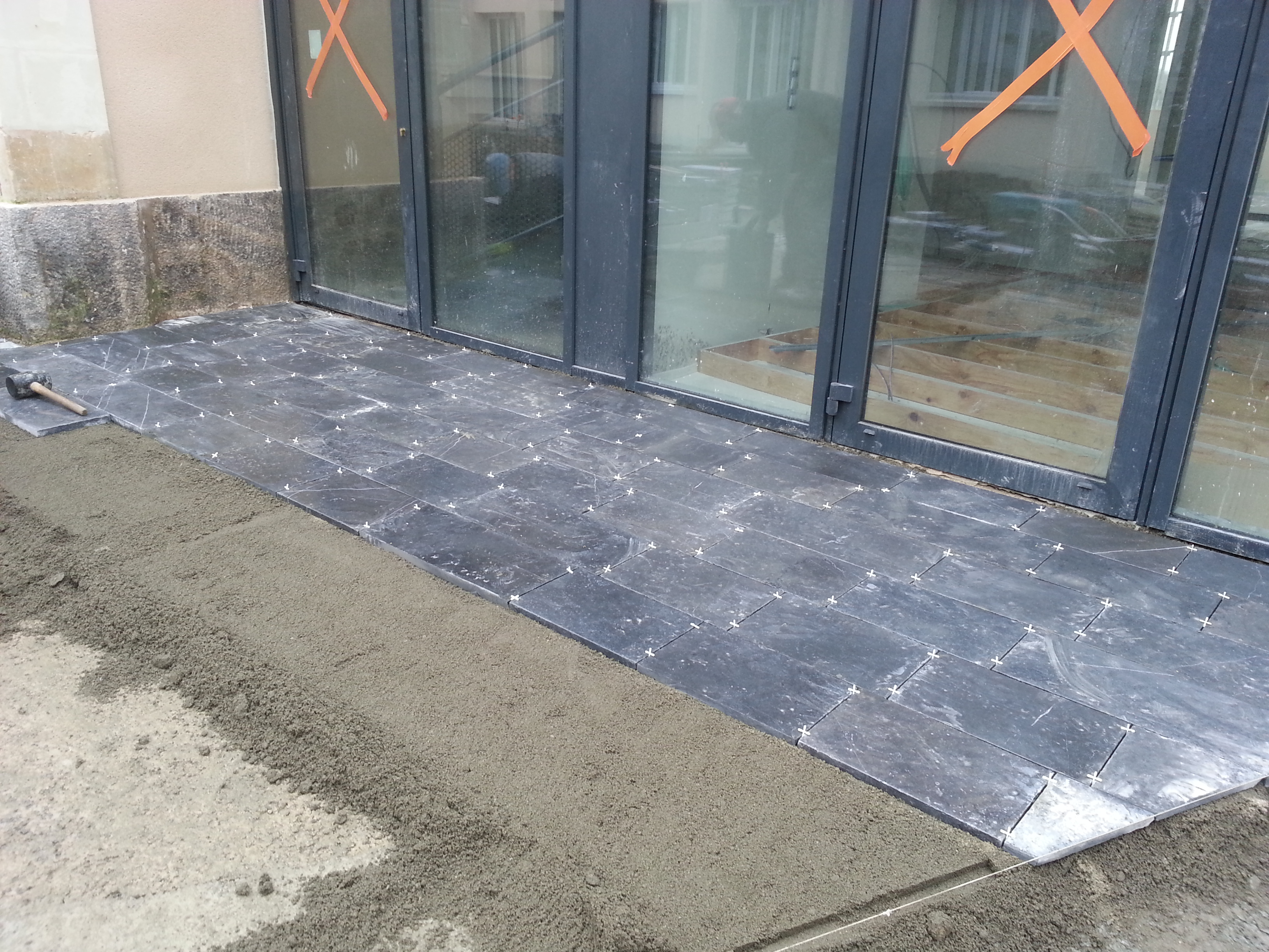 Décaissement, nivellement et mise en place d’un lit de sable ou d’un mortier selon la technique de pose retenue. Cette étape garantit un dallage stable et durable, résistant aux variations climatiques.