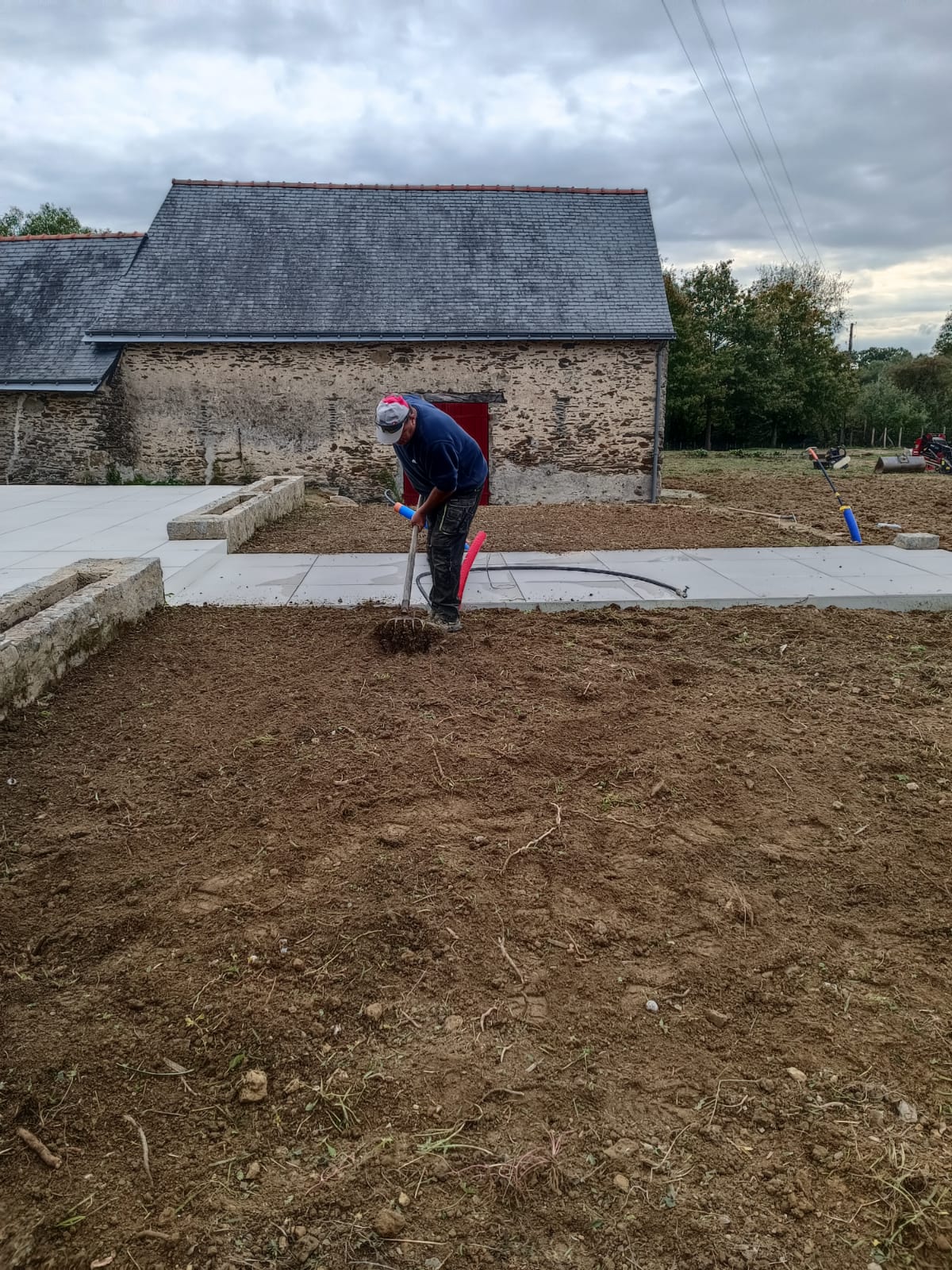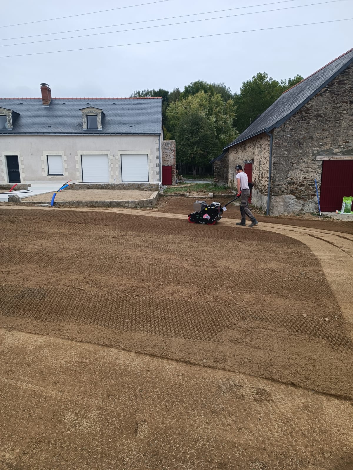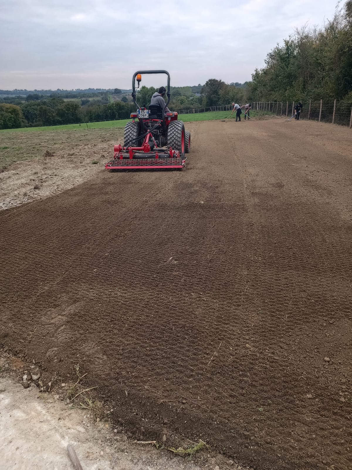 Grâce à nos outils spécialisés (motoculteur, herse rotative, rouleau), la terre est affinée et aplanie pour obtenir un terrain prêt à recevoir le semis ou le plaquage, sans irrégularités.