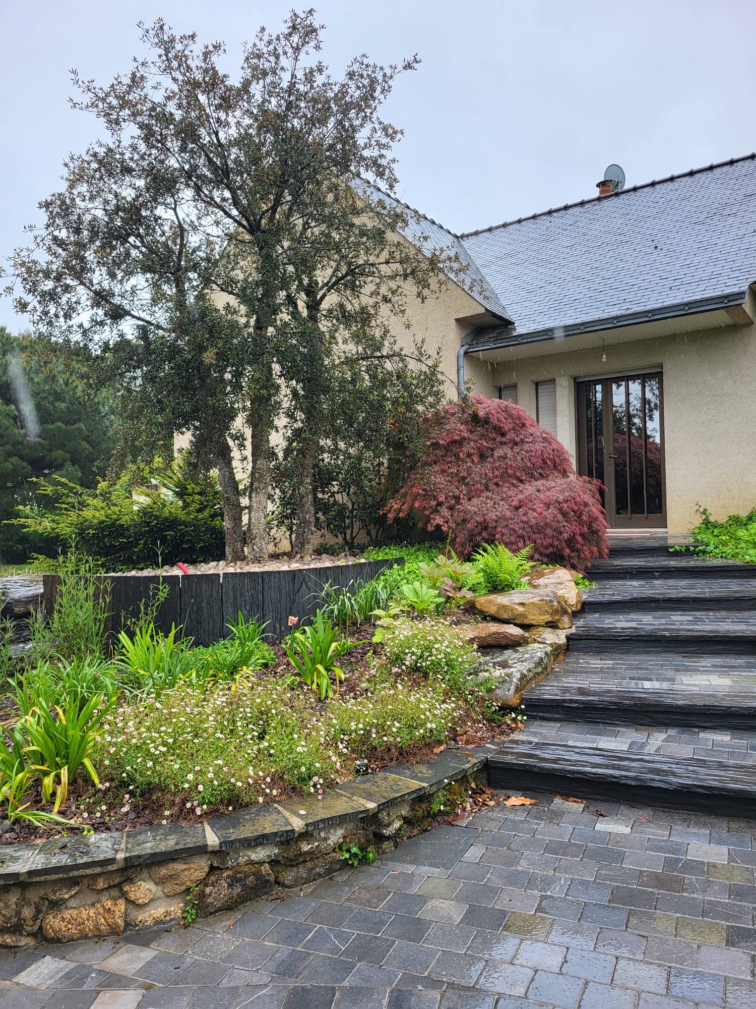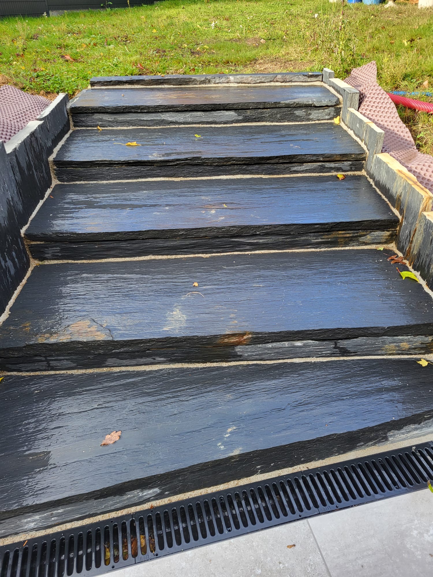 Bois, pierre naturelle, béton ou pavés : chaque matériau est posé avec soin pour garantir un alignement parfait, une hauteur de marche régulière et une esthétique adaptée à votre style de jardin.